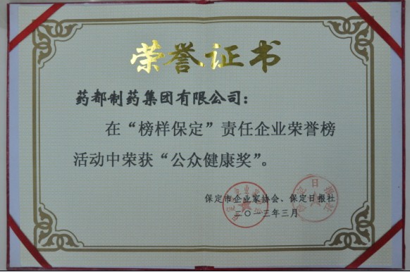 2013年3月29日,保定市工業(yè)和信息化局發(fā)布了評(píng)審結(jié)果,我公司在“榜樣保定”責(zé)任企業(yè)榮譽(yù)榜活動(dòng)中榮獲“公眾健康獎(jiǎng)”。