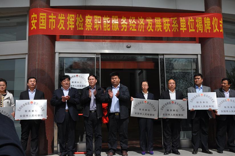 2015年4月17日上午,保定市檢察院、安國市委、市政府、檢察院在我公司舉行“安國市發(fā)揮檢察職能,服務(wù)經(jīng)濟發(fā)展聯(lián)系單位揭牌儀式”,我公司在內(nèi)的8家企業(yè)被安國市檢察院列為“安國市發(fā)揮檢察職能,服務(wù)經(jīng)濟發(fā)展聯(lián)系單位”。