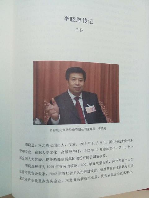 由保定市企業家協會編纂,保定市市長馬譽峰、保定市企業家協會會長、政協保定市第十屆主席王慶明作序的《創業史-保定企業》叢書第一集已由吉林大學出版社正式出版發行。該書旨在為企業歌功頌德,為企業家樹碑立傳,藥都制藥集團董事長李曉恩先生的個人傳記被收錄其中。