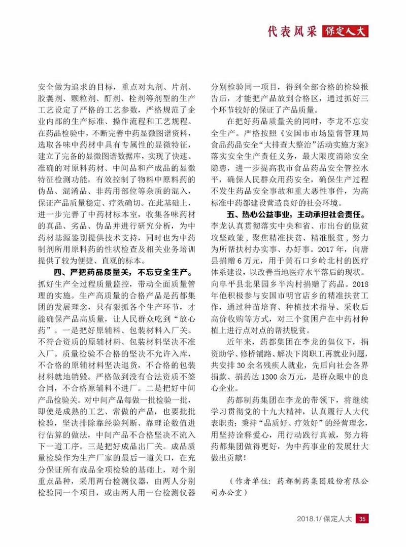 李龍,保定市人大代表,藥都制藥集團股份有限公司總經理。一直以來,他都非常珍惜人大代表這一榮譽, 始終牢記人大代表的使命,自覺踐行人大代表的職責,在經營好企業的同時,始終把自己放在為廣大群眾代 言的位置,不負群眾的信任和重托,認真履行人大代表的神圣職責,做到情為群眾所系,利為群眾所謀,用 自己的真情和汗水贏得群眾的信任和贊譽。